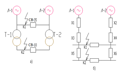Рисунок 2.2 – Расчетная схема (а) и схема замещения (б).