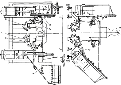 Механизм подъема питателя состоит из двух пневматических цилиндров 4, поворачивающих вал 12, установленный в подшипниках на раме машины. Рычаги вала подвесками соединены с траверсой питателя. Цилиндры 4 установлены на раме машины на цапфах, обеспечивающих возможность поворота в вертикальной плоскости. Положение питателя по высоте фиксируется двумя пневматическими стопорами 3, управляемыми одним краном. На вертикальных направляющих стойках рамы машины закреплены зубчатые рейки 8, с которыми входят в зацепление гребенки стопоров 3, закрепленных на траверсе. К рейкам гребенки прижимаются пружинами стопора, а выводятся из зацепления под воздействием на поршень сжатого воздуха, подаваемого в цилиндр стопора. В транспортном положении питатель фиксируется задвижными стопорами, которые запираются закладными штырями.