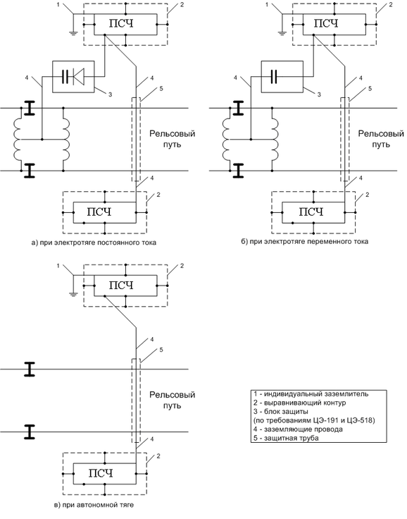Поскольку шкаф ПСЧ расположен, как правило, на расстоянии 3,1 м от оси пути (Рис. 5 .4), то согласно Инструкции ЦЭ-191 на электрифицированных железных дорогах необходимо выполнить заземление на тяговые рельсы или среднюю точку дроссель-трансформатора. Принимая во внимание изложенные выше требования, на рис. 5.4 приведены схемы заземлений при электрической и автономной тяге. В общем виде комплект заземляющих устройств составляет: