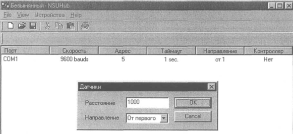 В открывшемся окне параметров колесных датчиков (КД) установить расстояние между ними,установленного для данного ПСЧ в мм и направление. Если выбирается направление «от первого» и первым приходит импульс от 1-го КД, то направление движения - четное (в 266 сообщении - О), а если первым приходит импульс от 2-го КД, то направление движения - нечетное (в 266 сообщении - 1). Если выбрать направление «от второго», и первым приходит импульс от 2-го КД, то направление движения - четное (в 266 сообщении - 0), а если первым приходит импульс от 1-го КД, то направление движения -нечетное (в 266 сообщении - 1).