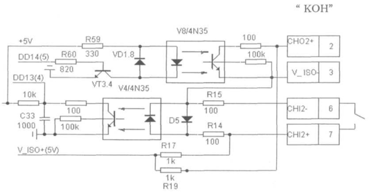 Входные цепи каналов общего назначения поступают через токоограничительные резисторы R12, R13 и R14, R15 (Рис.5) на светодиоды оптопар V3 и V4. Для организации возможности управления каналов общего назначения от входных сигналов, цепи, связанные с анодом фотодиода, подключаются через сопротивления R16 и R17k положительному потенциалу источника питания 5В, а цепи, связанные с катодом светодиода — к отрицательному потенциалу этого же источника.