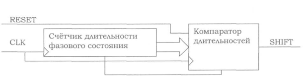 Сигнал RESET поступает от детектора фазовых переходов. По этому сигналу происходит анализ состояния счетчика длительности фазового перехода, а счетчик затем сбрасывается. Если длительность фазового состояния находится в пределах 8... 15 мкс (соответствует частоте 40 кГц+25%), или 20...30 мкс (соответствует частоте 20 кГц +25%), вырабатывается импульс разрешения для сдвигового регистра длительностью в 1 период тактовой частоты CLK. Если длительность фазового состояния к моменту поступления сигнала RESET находилась в диапазоне 0...7 мкс, или 16... 19 мкс, сигнал разрешения сдвига не формируется. В отсутствии сигнала RESET, сигнал разрешения сдвига формируется при изменении состояния счетчика от значения 19 к значению 20, и при изменении состояния счетчика от состояния 29 к состоянию 30. Во втором случае компаратор длительности вырабатывает сигнал останова для счетчика. Счет будет возобновлен только после поступления сигнала сброса. Количество импульсов разрешения сдвига в зависимости от длительности фазового перехода приведено в табл. 5 Таблица 5