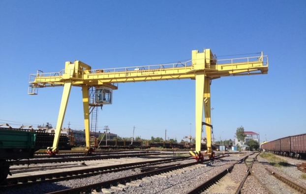 При переработке штучных и сыпучих материалов, поступающих на разгрузочную площадку водным путем, автомобильным транспортом или в других случаях, требующих увеличения площади, обслуживаемой краном, пролетное строение козловых кранов выполняется с одной или двумя консолями. Высота этих кранов выбирается в зависимости от заданной высоты подъема груза, а также с учетом габаритов предметов и сооружений, над которыми надо переместить грузы – эстакады, железнодорожные подъездные пути с транспортом, штабеля материалов и т. д. В зависимости от профиля обслуживаемой площадки ходовые тележки могут быть расположены на одинаковых или разных уровнях. В некоторых случаях одна из ходовых тележек расположена на уровне пролетного строения. Такие краны называются полукозловыми.