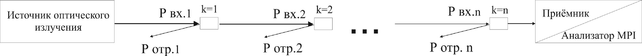 Для выявления закономерностей появления многолучевой интерференции был произведен ряд экспериментов по наращиванию волоконно-оптической линии связи путем последовательного присоединения оптических шнуров длиной 1,5 м. Схема установки, для проведения измерений MPI и выходной мощности оптического сигнала изображена на рисунке 2.
