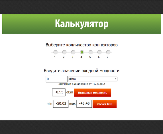Основной целью, поставленной в магистерской диссертации, была оценка влияния количества разъемных соединений на величину MPI и выходной мощности, а также разработка онлайн калькулятора для получения значений многолучевой интерференции и мощности выходного сигнала при изменении входной мощности и количества разъемных соединений. В ходе работы были получены следующие результаты: