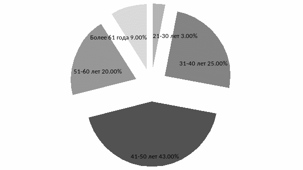 | Сотрудники, возраст которых составляет менее 30 лет | 5 | 22,7 | 2 | 40,0 | 3 | 60,0 | |