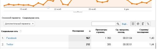 Переходы из сетей – отчет отображает динамику трафика из социальных сетей в сравнении с общим трафиком сайта, а также в удобной табличной форме отображает основную информацию по различным социальным сетям (Посещения, Просмотры страниц, Ср. продолж. посещ., Страниц/посещение), рис.9