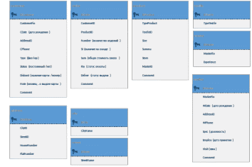 На рисунке 11 показаны таблицы с названиями полей, в которых пользователи данного программного продукта намерены хранить определенную информацию, связи между таблицами, а также таблицы, которые являются основными и вспомогательными.