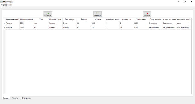 Интерфейс главного окна содержит вкладки основных таблиц, кнопки добавить, редактировать и удалить запись (рисунок 5).