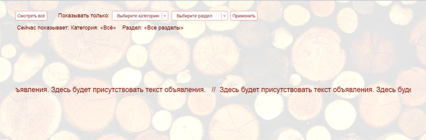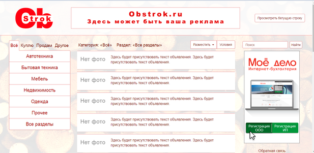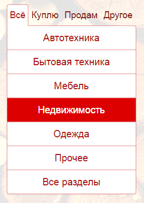 Навигационное меню позволяет выбирать объявления из определенной ктергории и раздела.
