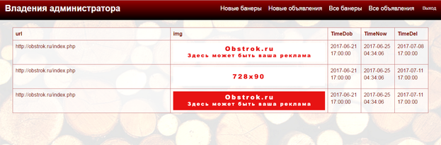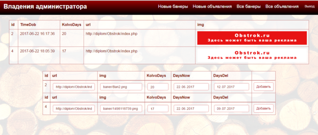 Внутри административного раздела имеется четыре вкладки для работы с подаваемыми объявлениями и банерной рекламой: «Новые банеры», «Новые объявления», «Все банеры», «Все объявления». Все данные выводятся таблицами.