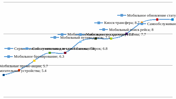 Таким образом, по результатам исследования, проведенного SITA, наибольшим индексом востребованности среди пассажиров характеризуются следующие сервисы: мобильный путеводитель (7,5), мобильная навигация по аэропорту (7,7), мобильные посадочные талоны (7,7), мобильный поиск рейса (8,0), мобильное обновление статуса рейса (8,9) и самообслуживание при посадке (8,9) [12].
