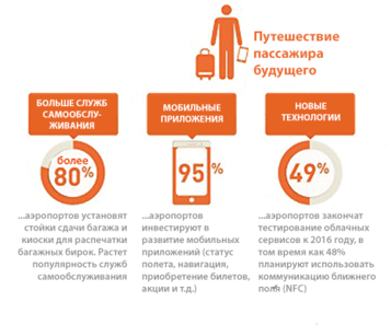 Установлено, что две трети аэропортов планируют крупные инвестиции в IT-решения в этой области. Учитывая усиливающуюся роль мобильных устройств в повседневной жизни людей по всему миру, уже сейчас почти в каждом аэропорте (90 процентов) внедрены или тестируются мобильные сервисы для пассажиров. При этом 74 процента аэропортов в течение следующих пяти лет планируют протестировать мобильные приложения, основанные на обработке контекстной информации и данных о местоположении пассажиров [8].