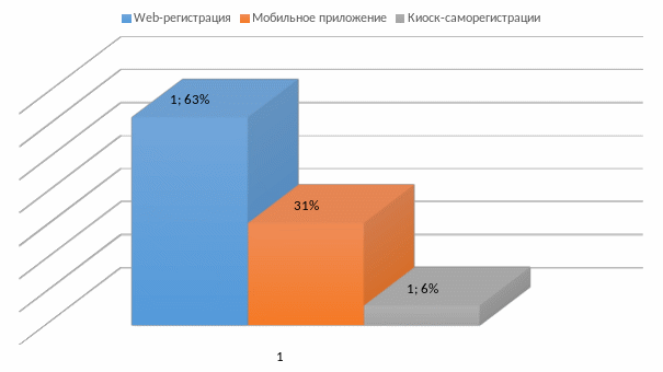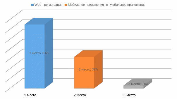 Проанализировав данные следует отметить, что наибольшей популярностью пользуется регистрация с помощью web -– сайта - 63 процента, на втором месте - мобильное приложение - 31 процент, на третьем - киоски саморегистрации - 6 процентов.