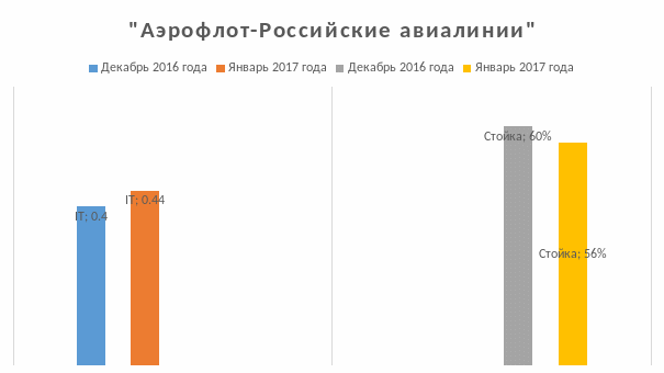 Доля пассажиров авиакомпании «Аэрофлот-Российские авиалинии, использовавших информационные технологии в декабре 2016 г., составила 40 процентов, в январе 2017 г. – 44 процента. В данный период наблюдается рост числа пассажиров, использовавших информационные технологии. В декабре 2016 года доля пассажиров, прошедших регистрацию на стойке с агентом составила – 60 процентов, в январе – 56 процентов.
