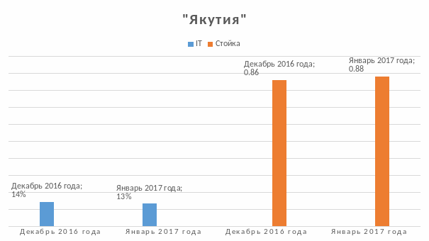 Доля пассажиров авиакомпании «Якутия», использовавшая информационные технологии, в декабре 2016 г., составила 14 процентов, в январе 2017 г. – 13 процентов, в январе доля пассажиров, воспользовавшихся информационными технологиями, незначительно, сократилась. Доля пассажиров, прошедших регистрацию на стойке с агентом, в декабре 2016 г., составила - 86 процентов, в январе 2017 г. – 88 процентов.