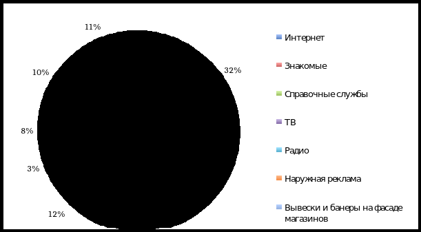 В ходе опроса были выявлены основные источники, из которых посетители магазинов узнали о сети «ИнтерьерПол ДВ». Такая информация необходима для того чтобы разработать план информационной поддержки стимулирующих акций. На рисунке 10 отражены основные источники информации о сети магазинов «ИнтерьерПол ДВ».