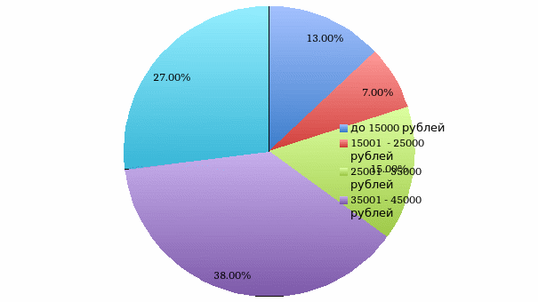 | До 15000 руб. (13%) | 15001-25000 руб. (7%) | 25001-35000 руб. (15%) | 35001-45000 руб. (38%) | 45001 руб. и выше (27%) | ||