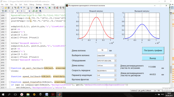 Основываясь на характеристиках выбранного оптического волокна и параметрах аппаратуры, программа будет рассчитывать длины регенерационного участка по затуханию и по дисперсии, по формулам (2.8) и (2.11) и моделировать входной и выходной импульс.