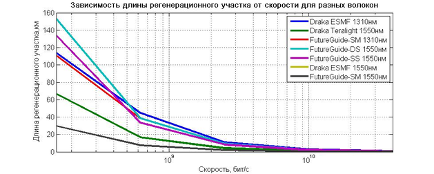 Рисунок 5.1 Зависимость длины регенерационного участка от скорости передачи для разных видов оптических волокон