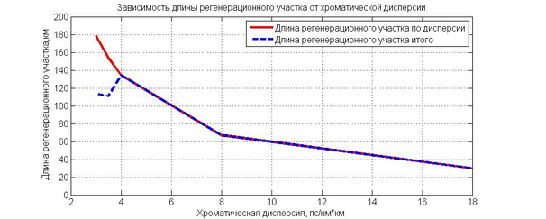 С учетом значений коэффициента хроматической дисперсии построен график, представленный на рисунке 5.2. На графике представлены длина регенерационного участка по дисперсии, которая в первую очередь зависит от хроматической дисперсии, и длина регенерационного участка итоговая, учитывающая и дисперсию, и затухание.