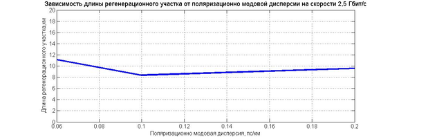 Рисунок 5.4 График зависимости длины регенерационного участка от коэффициента поляризационно-модовой дисперсии при скорости 2,5 Гбит/с