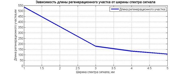 По графику зависимости длины регенерационного участка от ширины спектра источника (рисунок 5.6) можно сделать вывод, что максимальная длина линии уменьшается с увеличением ширины спектра. То есть использование узкополосных источников, приводит к увеличению длины регенерационного участка.