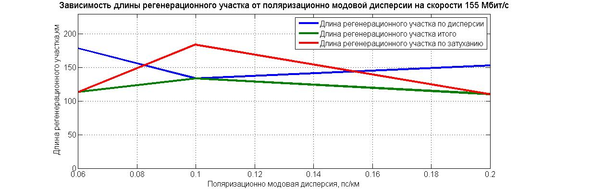Так же по значениям коэффициента поляризационно-модовой дисперсии был построен график, представленный на рисунок 5.3. На графике представлены три кривых: длина регенерационного участка по дисперсии, длина регенерационного участка по затуханию и итоговая длина регенерационного участка.