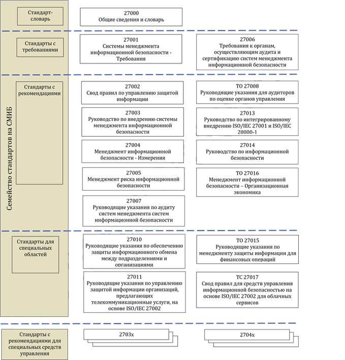 Эти стандарты были переведены на русский язык и считаются официально действующими стандартам Российской Федерации. Необходимо выделить, то что только несколько документов из серии были введены в действие, что в очередной раз подчеркивает неприемлемость ряда положений серии не только потребностям и взглядам российских органов по стандартизации в сфере информационной безопасности, но и требованиям российского законодательства. Таким образом, в ходе рассмотрения было определено, что отдельно стоящих документов в области управления информационной безопасностью в Российской Федерации нет.