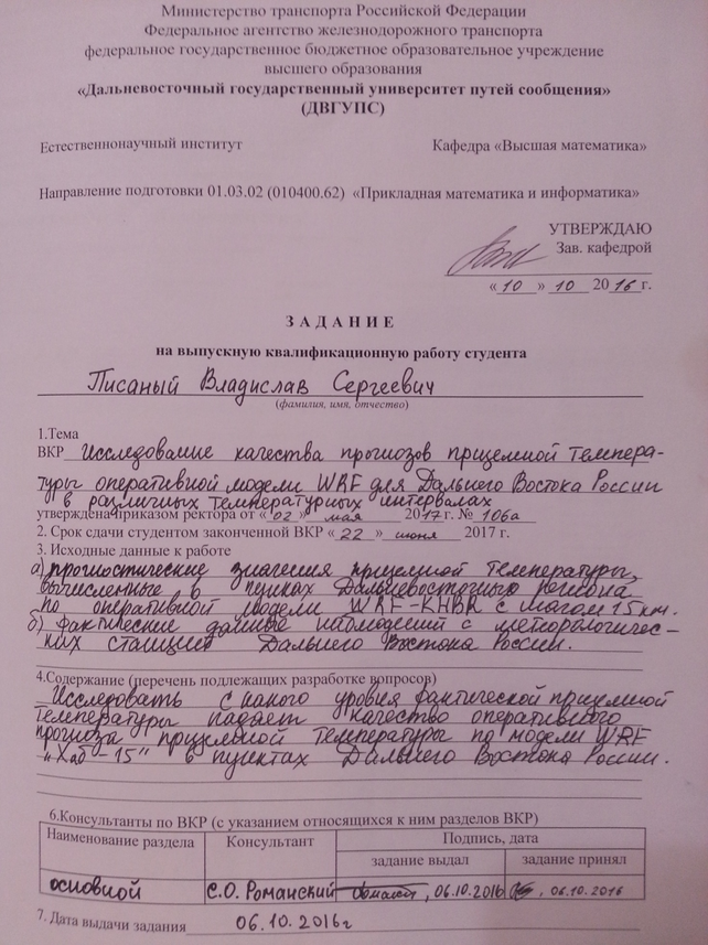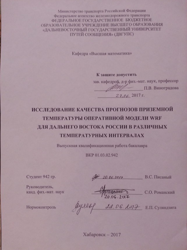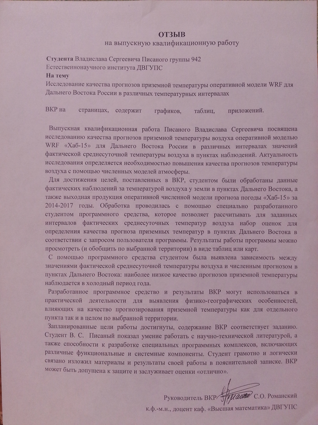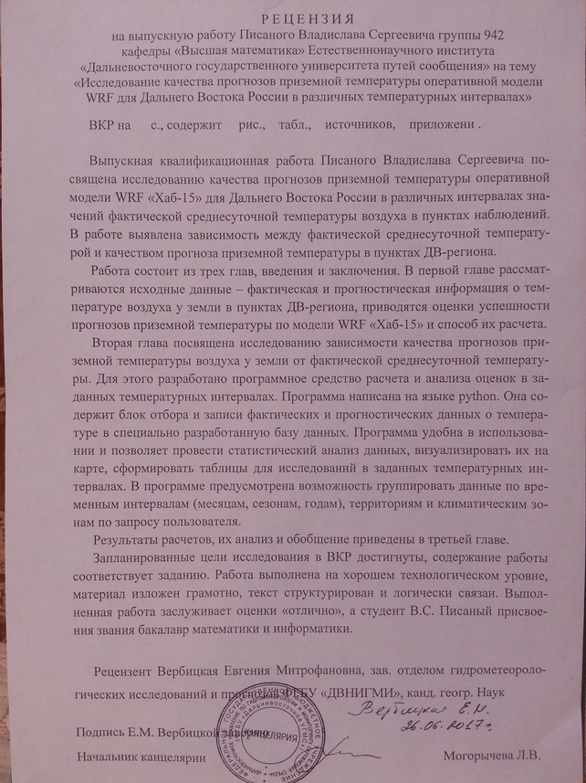 Для решения поставленных задач Росгидрометом были предоставлены архивы фактических и прогностических значений приземной температуры воздуха в пунктах наблюдения Дальнего Востока за 2014-2017 гг. С целью систематизации и анализа предоставленных данных разработан комплекс программ на языке программирования Python. В работе используются статистические, графические методы исследования поведения прогностической температуры и качества прогнозов.