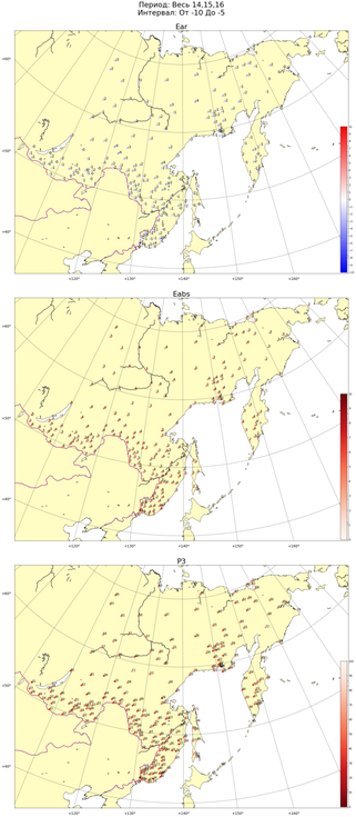 plotMap(map_templates, u'Период: %s\nИнтервал: %s'%(period, interval), map_data, cmaps, norms, filename, legend_sizes)