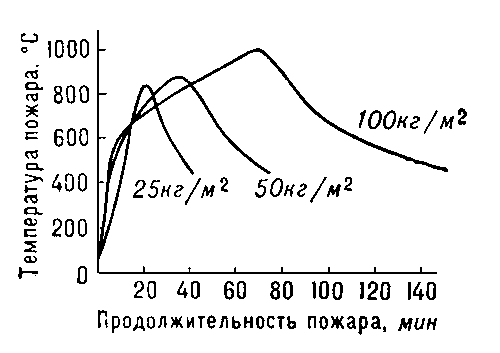 С увеличением количества горючего вещества на единицу площади пола (горючей загрузки) повышается максимальная температура и увеличивается продолжительность пожара (рисунок 1.3).
