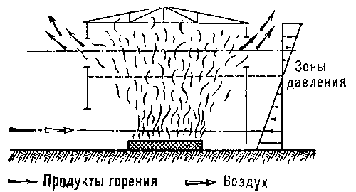 м2)]. Во время пожара происходят значительные перемещения воздуха и продуктов сгорания. Нагретые газообразные продукты сгорания устремляются вверх, вызывая приток более плотного холодного воздуха к зоне горения (рисунок 1.4). Направление движения нагретых продуктов обычно определяет и вероятные пути распространения пожара, т.к. мощные восходящие тепловые потоки могут переносить искры, горящие угли и головни на значительное расстояние, создавая новые очаги горения. Выделяющиеся при пожаре продукты сгорания (дым) образуют зону задымления. В состав дыма обычно входят азот, кислород, окись углерода, углекислый газ, пары воды, а также пепел и др. вещества.
