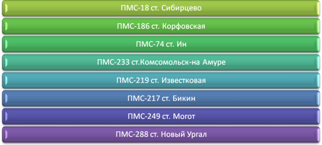 Данный рисунок показывает, что в состав Дальневосточной дирекции по ремонту пути входит 8 структурных подразделений: ПМС-18 (ст. Сибирцево), ПМС-186 (ст. Корфовская), ПМС-74 (ст. Ин), ПМС-217 (ст. Бикин), ПМС-219 (ст. Известковая), ПМС-233 (ст. Комсомольск-на-Амуре), ПМС-249 (ст. Могот), ПМС-288 (ст. Новый Ургал).