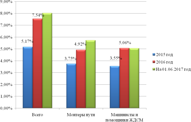 Данный рисунок показывает, что наибольшая текучесть кадров по профессии – машинисты и помощники ЖДСМ, монтеры пути.