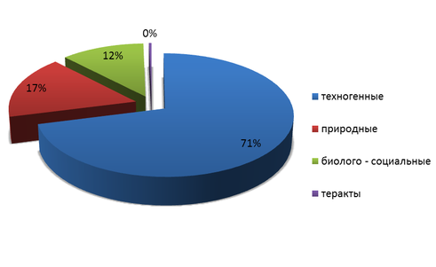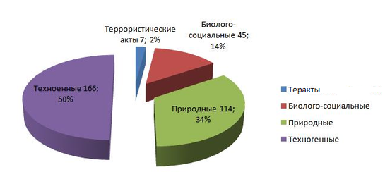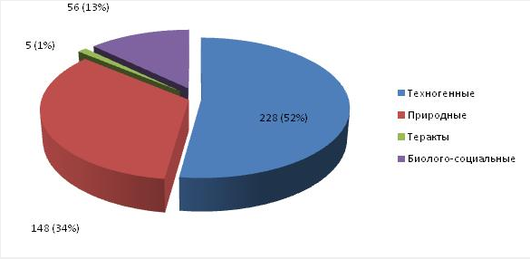 В 2012 году произошло 437 чрезвычайных ситуаций, в том числе локальных чрезвычайных ситуаций – 198, муниципальных чрезвычайных ситуаций – 196, межмуниципальных чрезвычайных ситуаций – 19, региональных чрезвычайных ситуаций – 22, федеральных чрезвычайных ситуаций – 2. В результате этих чрезвычайных ситуаций погибло 819 человек, пострадало 95 105 человек, произошло 228 чрезвычайных ситуаций техногенного характера, в результате которых погибло 600 человек, пострадало 24 075 человек; 148 чрезвычайных ситуаций природного характера – погибло 185 человек, пострадало 70 816 человек; 56 биолого-социальных чрезвычайных ситуаций – погиб 1 человек, пострадало 77 человек. В 5 террористических актах погибло 33 человека, пострадало 137 человек (рисунок 1.3).