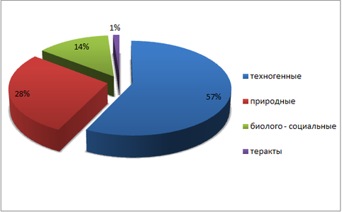 В 2013 году произошло 335 чрезвычайные ситуации, в том числе локальных чрезвычайных ситуаций – 155, муниципальных чрезвычайных ситуаций – 123, межмуниципальных чрезвычайных ситуаций – 11, региональных чрезвычайных ситуаций – 39, федеральных чрезвычайных ситуаций – 4. В результате этих чрезвычайных ситуаций погибло 631 человек, пострадало 208 439 человек, произошло 166 чрезвычайных ситуаций техногенного характера, в результате которых погибло 574 человека, пострадало 1542 человека; 114 чрезвычайных ситуаций природного характера – погибло 6 человек, пострадало 206 292 человека; 45 биолого-социальных чрезвычайных ситуаций – пострадало 362 человека, гибели людей не допущено (рисунок 1.4).