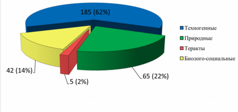 За период 2011 – 2015 год на территории Российской Федерации произошло 915 чрезвычайных ситуаций техногенного характера, 451 чрезвычайная ситуаций природного характера, 214 чрезвычайных ситуаций биолого- социального характера и 19 террористических актов (рисунок 1.1).