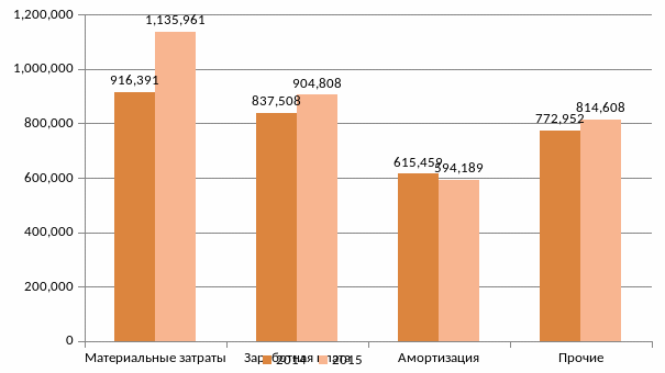 Такой показатель как материальные затраты в 2015 году составляет 1 135 961 тыс. руб., что на 219 578 тыс. руб. больше, чем в 2014 году. Рост данного фактора связан с повышением цен на материальные ресурсы, и с большим использованием покупных материалов.
