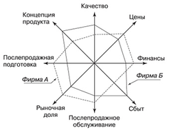 Суть данного метода заключается в сравнительной оценке ключевых свойств товара или услуг предприятия и товаров услуг конкурентов, и в последующей визуализации результатов сравнения в форме многоугольника: