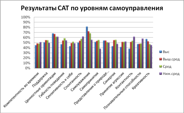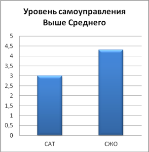 Результаты проведенного исследования показали, что уровень развития у студентов способности к сознательному управлению своим поведением и деятельностью имеет показатели устойчиво выше среднего САТ и СЖО с различными группами респондентов по уровню самоуправления, получаем следующие результаты:.