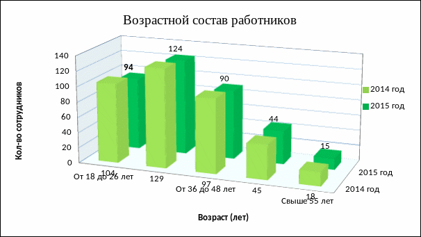 На рисунке представлена возрастная структура работников АО «Шелеховский КЛПХ» самой малочисленной возрастной категорией является свыше 55 лет, в этой категории трудятся передовики организации. На 2015 год количество сотрудников со стажем выше 55 лет уменьшилось, так как работники достигают пенсионного возраста и уходят в пенсионный отпуск. Основной категорией являются работники возрастной категорией от 26 до 36 лет. В 2015 году наблюдается количественное уменьшение работников по всем возрастным категориям, так как среднесписочное количество работников также уменьшилось на 2015 год.