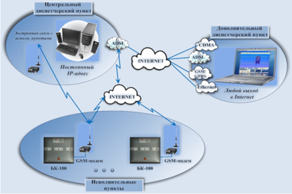 Соединение между исполнительными пунктами БК-100 и сервером происходит через GSM-модем.