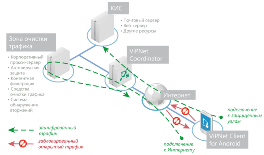 Для управления функциями ViРNet Client for Android используется графический интерфейс, дизайн которого выполнен в стандартах операционной системы Android, существует возможность использовать виджеты на рабочий стол, отображающие текущий статус подключения. Схема взаимодействия устройства с ПО ViРNet Client for Android и другими компонентами сети отображена на рисунке 3.2.4.1.