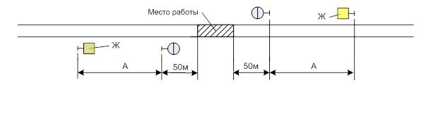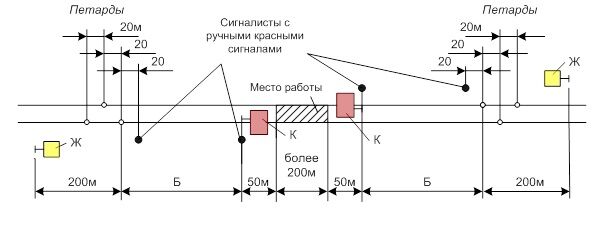 Рис. 6.1 Схема ограждения места производства работ на перегоне, требующая остановки поезда, при фронте работ более 200м