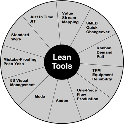 Существует множество инструментов бережливого производства. К наиболее популярным из них относят 11 инструментов, оригинальные наименования которых представлены на рисунке 1 .