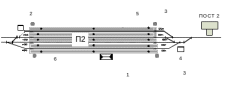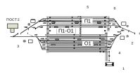 Рисунок 1.5 – Схема парка прибытия П2 - 1 – помещение оператора ПТО; 2 – помещением для отдыха и обогрева смотровых бригад; 3 – мачта освещения; 4 – устройство централизованного ограждения; 5 – твердое покрытие парков; 6 – колонки переговорные громкоговорящей связи