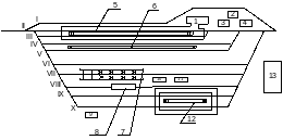 Рисунок 1.20 - Промыво-пропарочная станция - I, VI - технологические пути; II-III - пути закрытой эстакады; IV-V - пути открытой эстакады; VII - путь текущего отцепочного ремонта; VIII - путь для наружной обмывки цистерн; IX-X - пути для обработки цистерн из-под этилированного бензина; 1 - ремонтные и служебно-бытовые помещения, пожарный пост; 3 - дегазационная установка; 4 - кладовая; 5 - закрытая эстакада для горячей обработки цистерн; 6 - открытая эстакада; 7 - стационарные домкраты; 8 - ангар для наружной обмывки котлов цистерн; 9 -дегазационная установка: 10 - насосная станция; 11 - резервуар с моющим раствором для наружной обмывки цистерн: 12 -площадка для обработки цистерн из-под этилированного бензина; 13 - очистные сооружения
