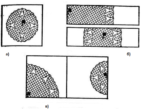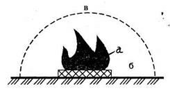 а) зона горения; б) зона теплового воздействия; в) зона задымления;