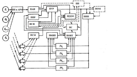 Управленческое решение – это приказ на выезд соответствующим пожарным подразделениям, который передаётся автоматически подсистемой передачи приказов по команде диспетчера пожарным частям. Исполнение приказа (выезд пожарных автомобилей) автоматически контролируется на диспетчерском пункте подсистемы контроля и исполнения приказов (ПКИП) при поступлении сигналов от датчиков, установленных в местах стоянок автомобилей в пожарных частях. При наличии подсистемы прогнозирования (ПП) развития пожара и выработки упреждающих решений приказы формируются с учётом выданных указанной подсистемой прогнозов. Структурная схема АСОУПО представлена на рисунке 2.2.